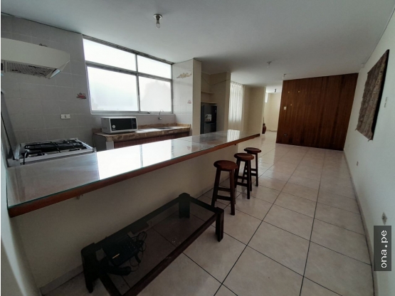 - Cocina abierta (kitchen) equipada con línea blanca: cocina, refrigeradora y microondas